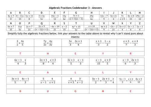 Simplifying Algebraic Fractions Codebreaker Teaching Resources