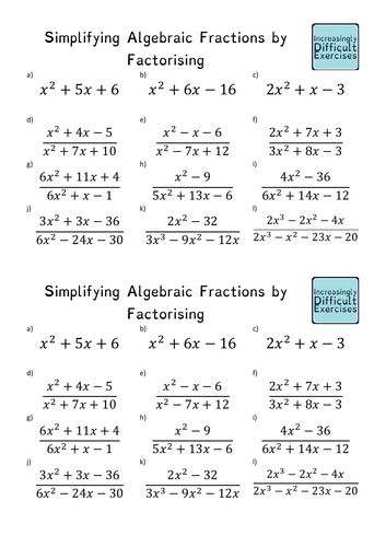 Increasingly Difficult Questions Simplifying Algebraic Fractions Teaching Resources