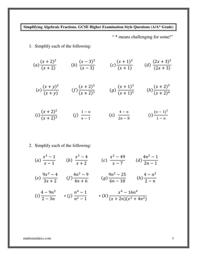 Simplifying Algebraic Fractions Worksheet With Answers Tes